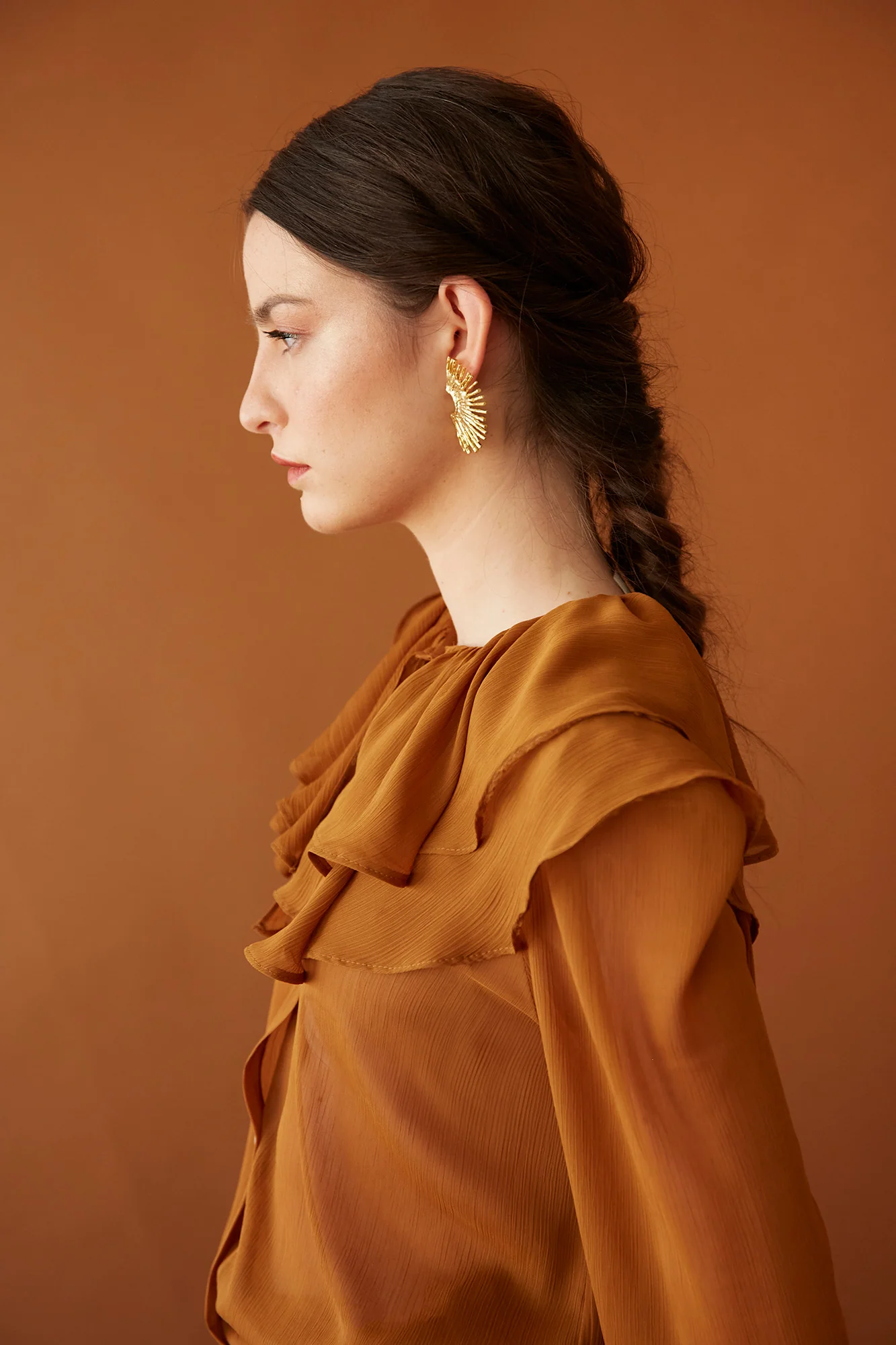 Eleva tu estilo con esta camisa elegante de la nueva colección Coosy. Confeccionada en un tejido ligero y vaporoso, presenta volantes en el pecho que aportan un aire romántico y sofisticado. Su tono tierra cálido es ideal para crear looks atemporales y versátiles. Perfecta para combinar con faldas midi, pantalones de tiro alto o como pieza protagonista en tus outfits de oficina y eventos especiales.