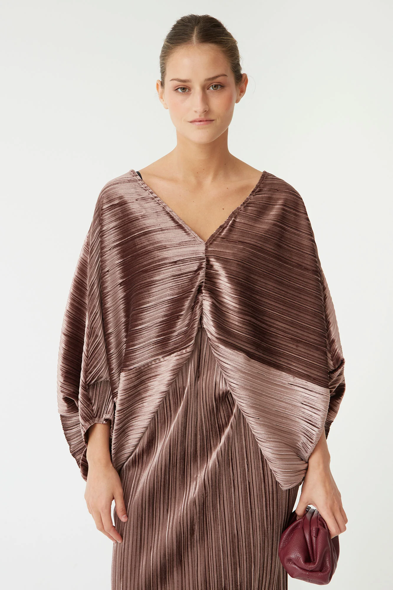 Este vestido largo de Coosy es la prenda definitiva para quienes buscan una combinación perfecta de elegancia y confort. Confeccionado en un suave tejido de terciopelo que destaca por sus pliegues verticales que aportan dinamismo y sofisticación. Su diseño fluido con un escote en V y detalles de drapeado en la parte delantera crean una silueta favorecedora, ideal para eventos formales o una salida nocturna.